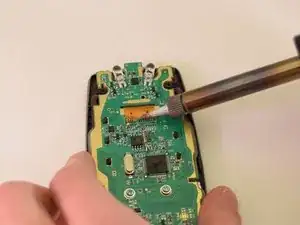 Используйте паяльник, чтобы расплавить припой, соединяющий ленту экрана с обратной стороной платы. Если припой не расплавляется легко, попробуйте использовать десодовочную оплётку.
