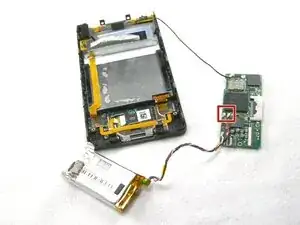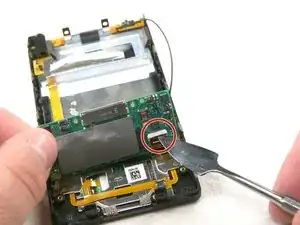 Осторожно приподнимите материнскую плату, расположенную в основании Zune. Отсоедините оранжевый ленточный кабель, как это делалось на предыдущих шагах.