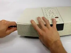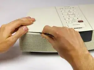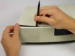 Как только панель будет освобождена с левой стороны, вставьте лопатку между верхней панелью и передней решеткой устройства, как показано.