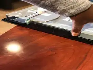 Далее поднимите рамку спереди телевизора (эти крошечные боковые винты всё сделали) и отложите её в сторону.