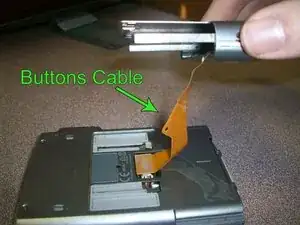 Отложите в сторону кнопки и выдвижной лоток, убедившись, что оранжевый кабель остаётся с ними.