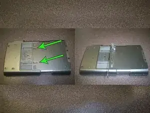 Пружины уступят под давлением. Как только Вы почувствуете это, потяните крышку вниз, удерживая скрепку/булавку, и продолжайте нажимать вниз. Это освободит заднюю крышку.