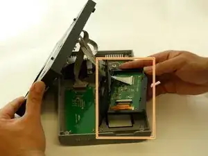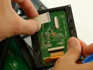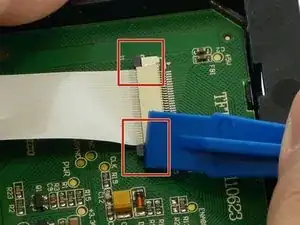 Отключите разъем ZIF, используя пластиковый инструмент для открытия, чтобы поднять небольшой фиксирующий флажок. Затем потяните за ленту вверх и вдали, извлекая из разъема.