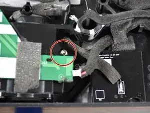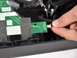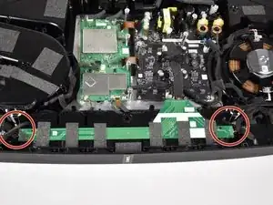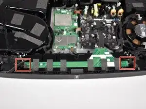 Отсоедините боковые динамики от зелёной печатной платы (PCB), проложенной вдоль верхней части основной акустической системы, сжав и потянув за разъём.