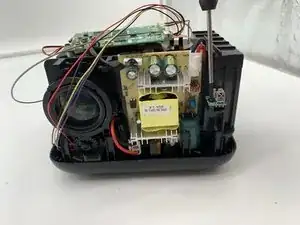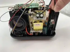 Тремя винтами с крестообразным шлицем закреплён корпус. Два находятся внутри отверстия, образованного предыдущим шагом, а третий расположен на нижней стороне проектора. Удалите все три.