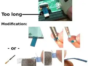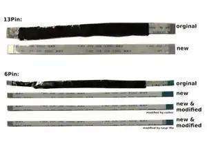 Купите новые кабели. Эти кабели называются FFC или FPC гибкие кабели. Расстояние между контактами (называемое шагом) — 0,5 мм. Длина кабеля оригинальная 12 см (подойдут также 10 см или 15 см). Подробнее: