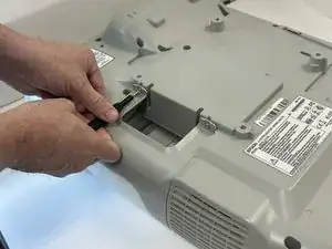 Крышка панели для источника питания находится на левом боку проектора, когда он перевернут.