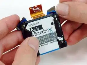 Отогните черную ленту, которая фиксирует два синих демпфера к жесткому диску возле оранжевого шлейфа.