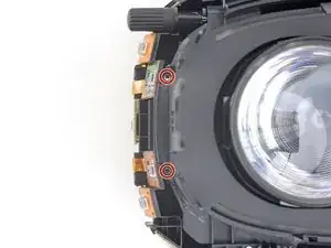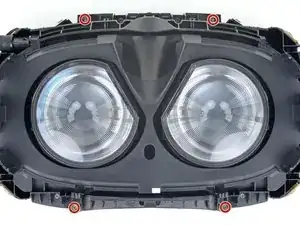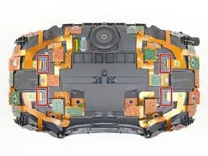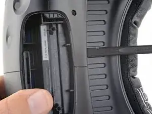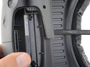 С помощью отвёртки Torx T5 отввинтите два винта длиной 12 мм, крепящие крепления ремня по обеим сторонам гарнитуры.
