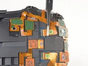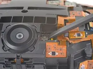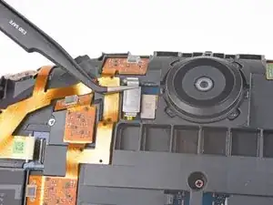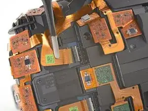 Используйте заострённый конец лопатки, чтобы приподнять маленькую фиксирующую планку на одном из ZIF-разъёмов сенсорной матрицы.