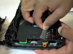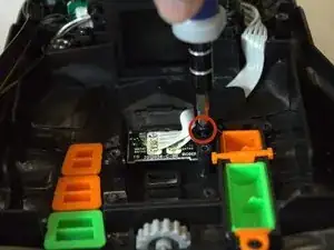 Удалите один черный винт Phillips #0 длиной 7,2 мм из пластикового элемента, прижимающего провода кардридера microSD.