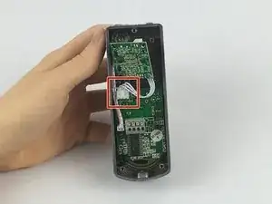 Сняв заднюю крышку уличной камеры, нажмите на первую серую кнопку с синей проводкой под ней, как показано на картинке.