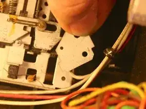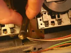 Удалите винт с крестообразным шлицем 5 мм, удерживающий синие и желтые провода на месте.