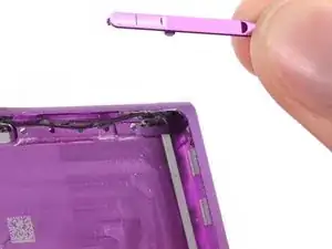 С помощью лопатки аккуратно вдавите качельку регулировки громкости внутрь устройства с внешней стороны.
