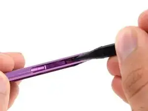Используйте заострённый конец лопатки, чтобы отжать узел кнопки управления громкостью от кромки корпуса.