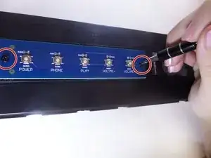 Положите устройство так, чтобы синяя панель с кнопками была сверху, и используйте отвертку с крестовой насадкой J00 (головка J1), чтобы снять по два 7 мм винта с каждой стороны панельки кнопок.