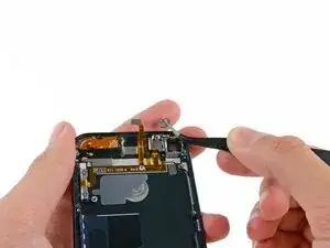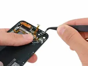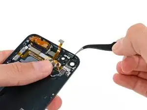 Пинцетом снимите небольшую металлическую опорную пластину с секции кабеля кнопки питания.