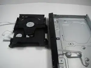 Удалите два винта с крестообразным шлицем #1 (серебристые, 3/16"), которые крепят DVD-привод к днищу плеера.