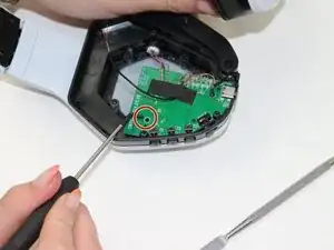 Используя отвертку Phillips #000, удалите пятый винт длиной 9 мм, который крепит левую часть гарнитуры.