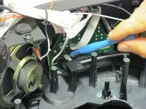 Используя синий пластиковый инструмент для вскрытия, разделите переднюю половину (с динамиками и индикатором) и заднюю половину (с антенной).