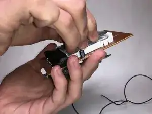 Возьмите пинцет и проследите красный и чёрный провода, идущие от динамика к плате. Они подключаются к белому разъёму. Вытяните белую вилку пинцетом, чтобы отключить.