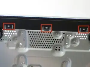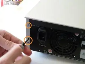 Затем удалите два черных винта 12 мм - по одному с каждой стороны задней части устройства - которые удерживают верхнюю панель на месте.