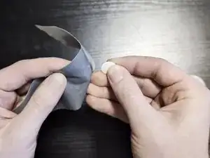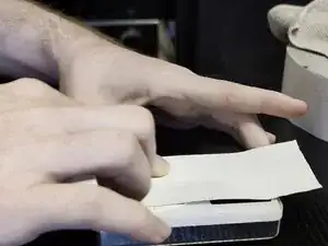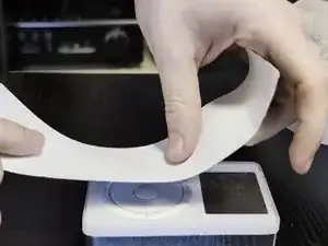 Положите iPod на прочный стол, затем аккуратно положите полоску ленты на колесо прокрутки и нажав на всю поверхность колеса прокрутки и центральную кнопку «Select».