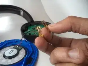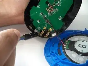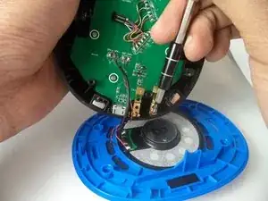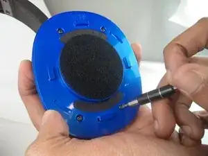 Используйте биту Phillips #0, чтобы удалить четыре винта (длиной 9.47 мм), которые стали видимыми после снятия амбушюры. Осторожно снимите синюю оболочку, чтобы получить доступ к аудиоплате.