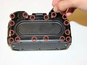 Для снятия жёсткой внутренней пластиковой крышки используйте крестовую биту Phillips #00, чтобы открутить 16 мелких винтов длиной 9 мм, окружающих сабвуфер на верхней стороне устройства.