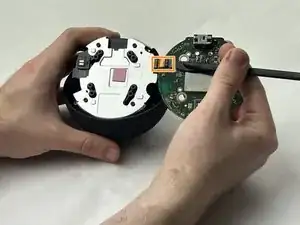 Пластиковой лопаткой отделите клей, фиксирующий ленту к верхнему корпусу. Затем откиньте защёлку на плате переключателя и вытяните ленту.