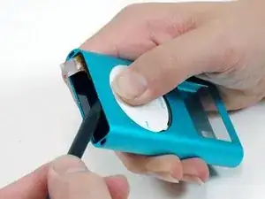 Используйте пластиковую лопатку, чтобы оттянуть небольшую черную пластиковую защелку, удерживающую клик-колесо на месте.