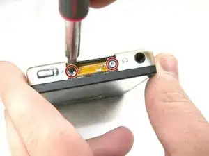 Используйте металлическую лопатку или инструменты для открытия Zune, чтобы снять маленькую серебристую пластиковую заглушку на верхней части устройства.