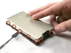 Используя металлическую лопатку или инструменты для открытия Zune, начните удалять алюминиевую заднюю панель с верхней части. С каждой стороны имеется по 5 зацепов и два внизу.