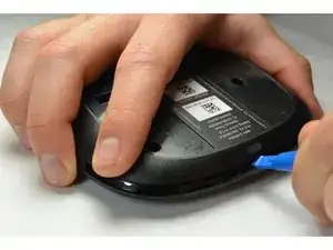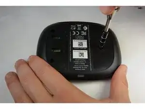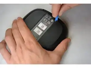 Оттяните резинку и удалите её. Это откроет доступ к винтам на дне устройства.