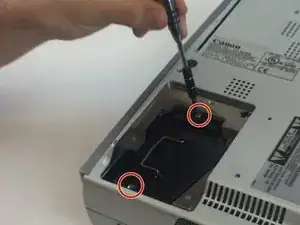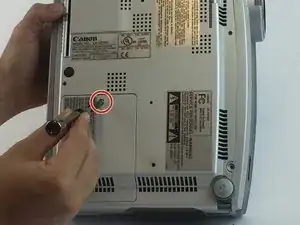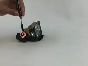 Открутите два винта Phillips #0 на 7 мм, которые крепят лампу к основному корпусу проектора.