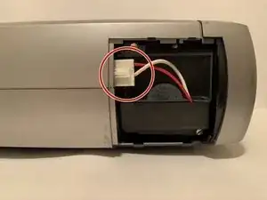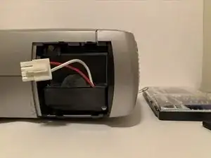 Осторожно отключите лампу от проектора, прижав белую вкладку на разъеме большим и указательным пальцами.
