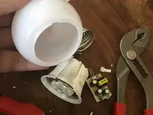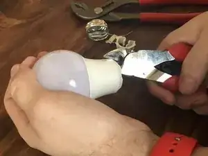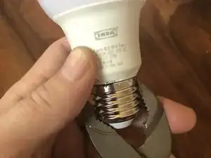 Затем используйте клещи с шарнирным механизмом, чтобы аккуратно раздробить и снять цокольную резьбовую часть лампы IKEA.