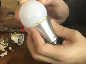 Начните с аккуратного удаления оставшихся осколков стекла из лампы Philips Hue. В этом примере стеклянные фрагменты уже удалены.