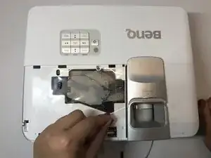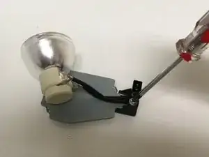 С помощью отвертки Philips #1 (PH1) ослабьте и снимите единственный винт размером 2.5 мм Phillips #1, который крепит корпус лампы к проектору.