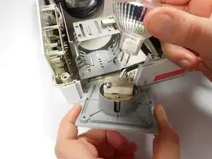 Переверните проектор в правильное положение и открутите два винта по 12 мм на панели лампы, расположенной на задней части проектора, с помощью отвертки Phillips #0.