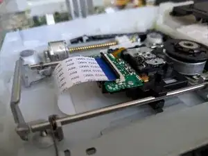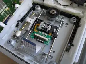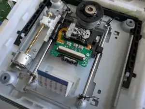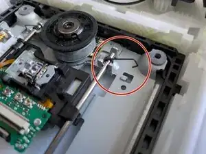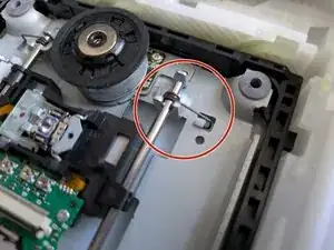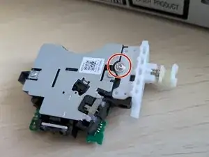 Переверните старый блок лазера. Снимите винт, удерживающий белый моторный рычаг на месте. Установите его на новый блок лазера.