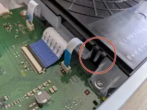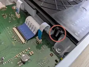 Осторожно откройте чёрный фиксатор на разъёме ленточного кабеля блока лазера.