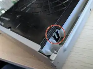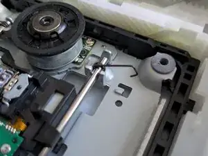 Вставьте обратно в привод, убедившись, что белый рычаг на стороне блока лазера входит в зацепление с червячной шестернёй.