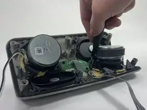 Удалите ленту, фиксирующую два провода, подключённых к динамику.