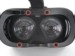 Используйте отвертку Torx T5, чтобы выкрутить четыре винта длиной 6,0 мм, фиксирующие облицовку лицевой прокладки на гарнитуре.