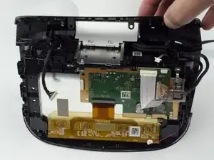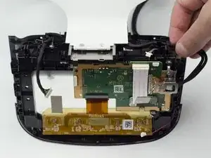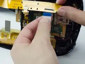 Аккуратно подденьте чёрный пластиковый элемент, прикрепляющий жёлтый шлейф к гарнитуре, чтобы отсоединить его от зелёной платы.