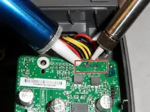 Используя горячий паяльник и либо насос для удаления припоя, либо вытяжку для припоя, удалите припой с 6 проводов, выделенных на фото красным.
