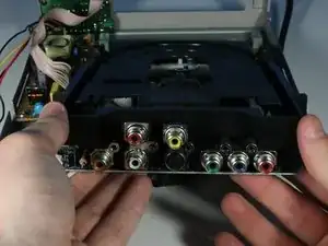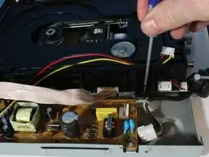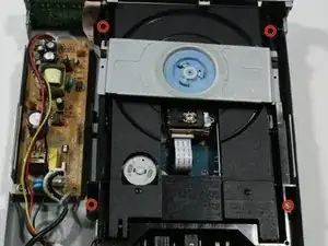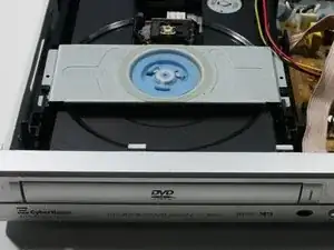 Для замены лотка диска сначала необходимо снять верхнюю и заднюю панели DVD-плеера, найти чёрный лоток диска и выдвинуть лоток.
