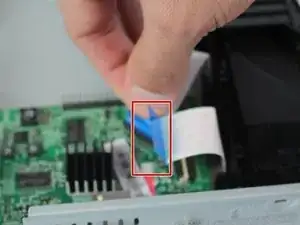 Возьмите за синюю защёлку и потяните вверх, чтобы извлечь ленточный кабель с материнской платы.
