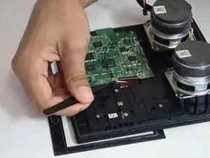 Используйте пинцет или руки, чтобы аккуратно отсоединить красные провода, соединяющие динамики с блоком питания.